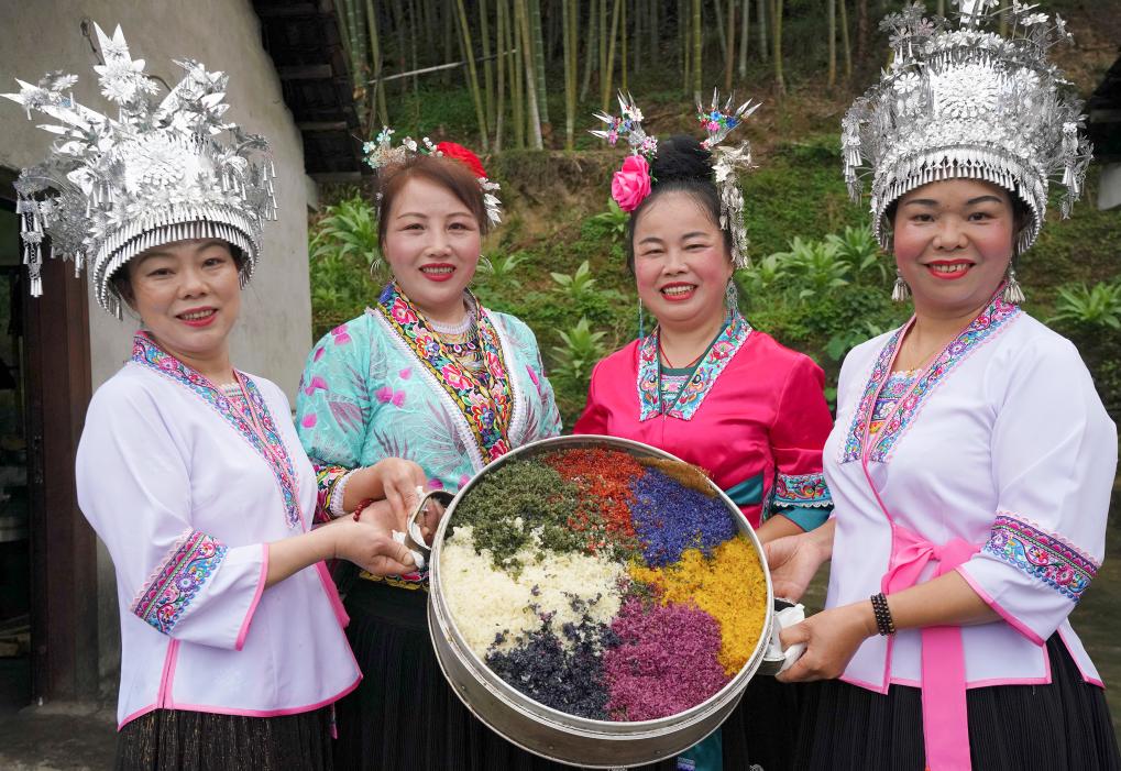5月5日,在廣西融水苗族自治縣懷寶鎮盤榮村,群眾在展示五色飯。