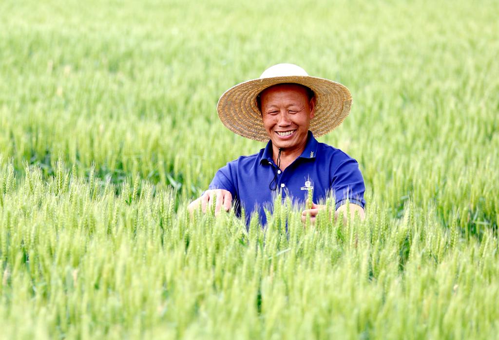 5月5日,山東省臨沂市郯城縣郯城街道陵坡村村民在田間查看小麥長勢。