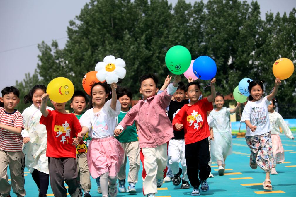 5月7日,在山東省臨沂市平邑縣保太鎮第三中心幼兒園,小朋友手持笑臉氣球快樂奔跑。