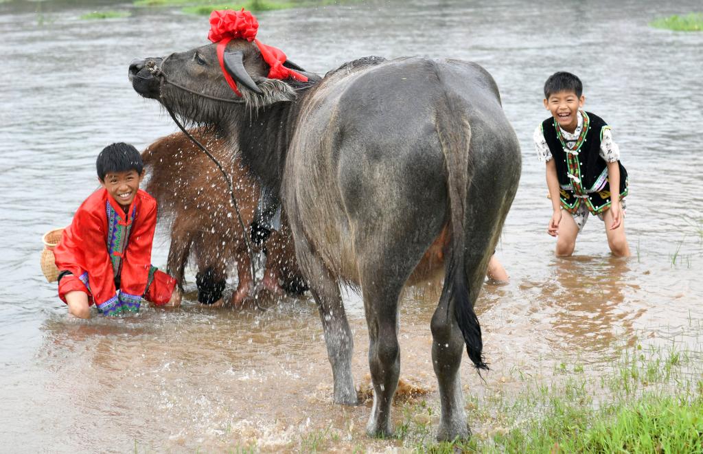 5月5日,在廣東省清遠市連山壯族瑤族自治縣上帥鎮東君村,身着壯族服飾的小朋友在中洲河裏沐牛。