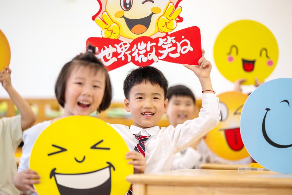 5月6日,浙江省湖州市長興縣實驗幼兒園,孩子們展示笑臉牌。