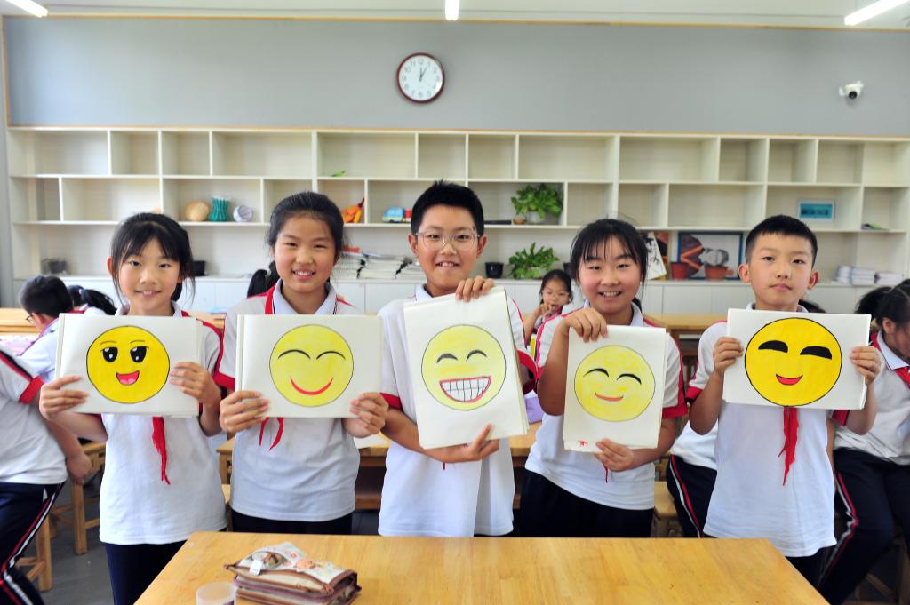 5月7日,湖北省宜昌市秭歸縣實驗小學學生在美術課堂上展示自己創作的笑臉卡通美術作品。