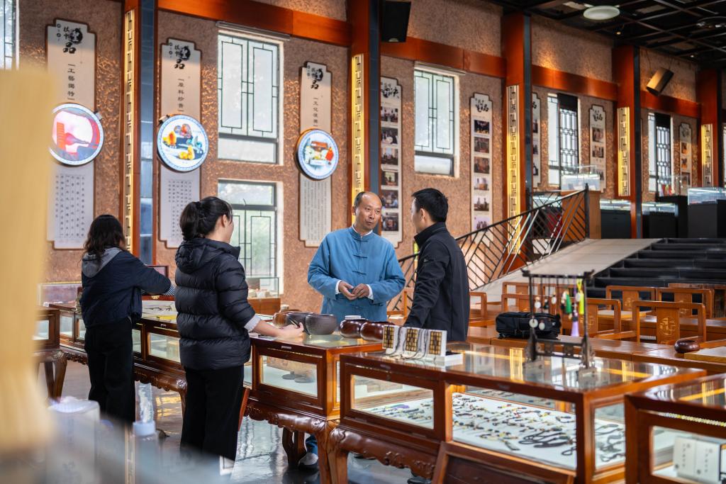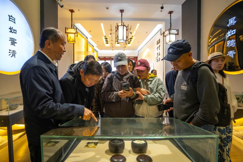11月19日,李國偉(左一)在保山市永子棋院內的永子博物館向游客介紹一副古代永子。