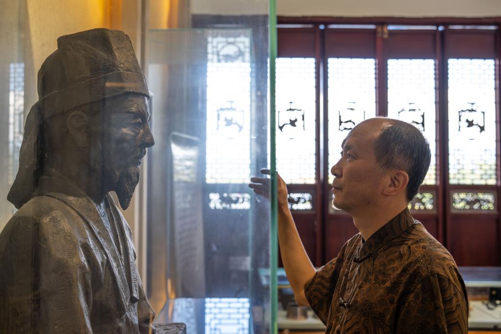 11月20日,在保山市永子棋院,李國偉注視李德章雕像。