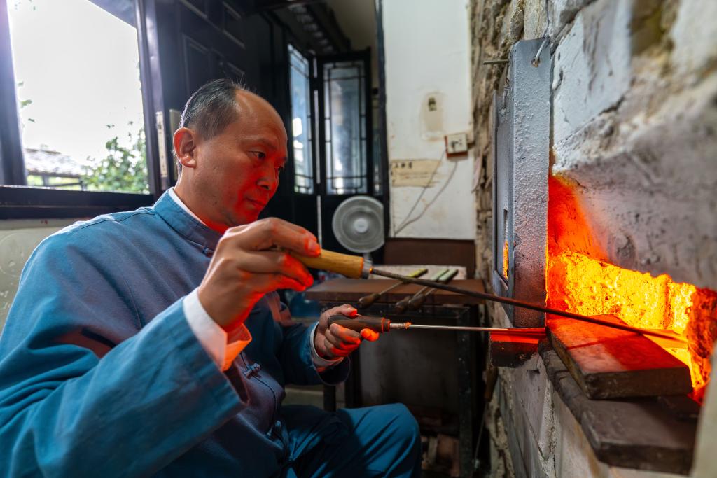 自小與永子相伴,李國偉從中悟出的遠不止製作技藝。“永子只有黑白兩色,卻包羅萬象;棋盤縱橫十九道,卻變化無窮,”他説,“永子從來不是拘泥於方寸之間的棋子。”在他眼中,棋如人生:玉石經熔煉而重生,心智在對弈中淬煉。1997年,20歲的李國偉師承伯父李學堂,開始學習製作永子。光陰荏苒,李國偉已帶徒傳藝,培養弟子150餘人。爐火不熄,薪火相傳,這門古老的手藝,有了更多人延續。