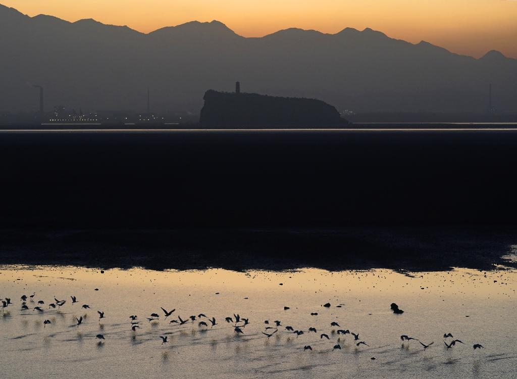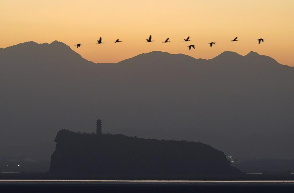 候鳥在江西省湖口縣鄱陽湖鞋山水域飛翔(11月26日攝)。