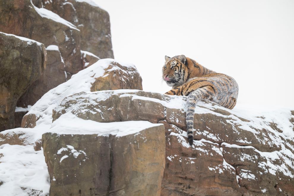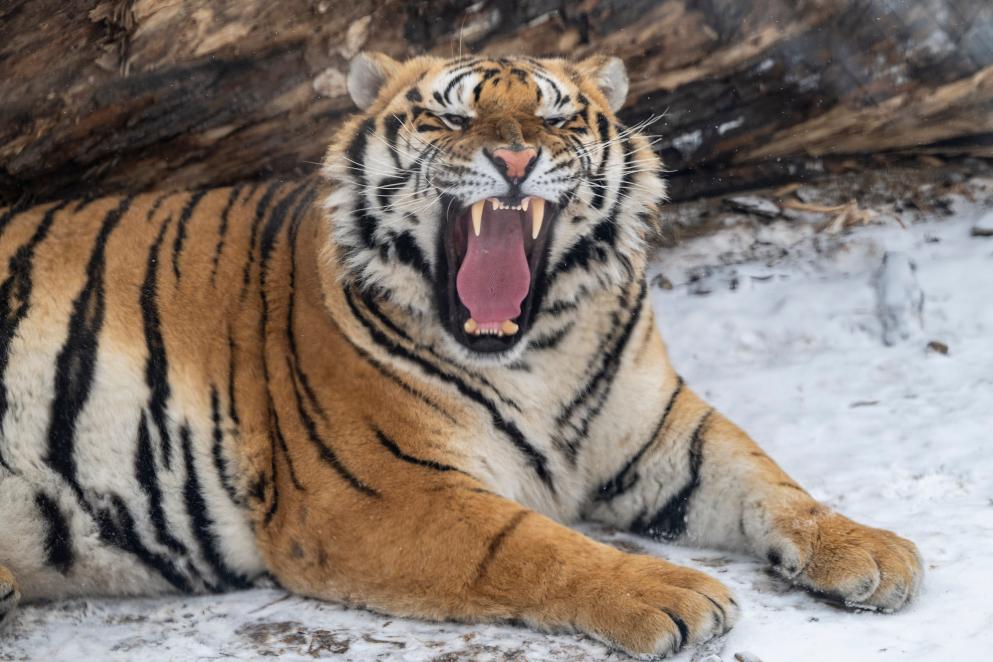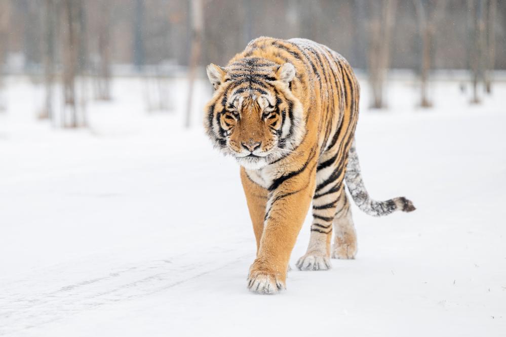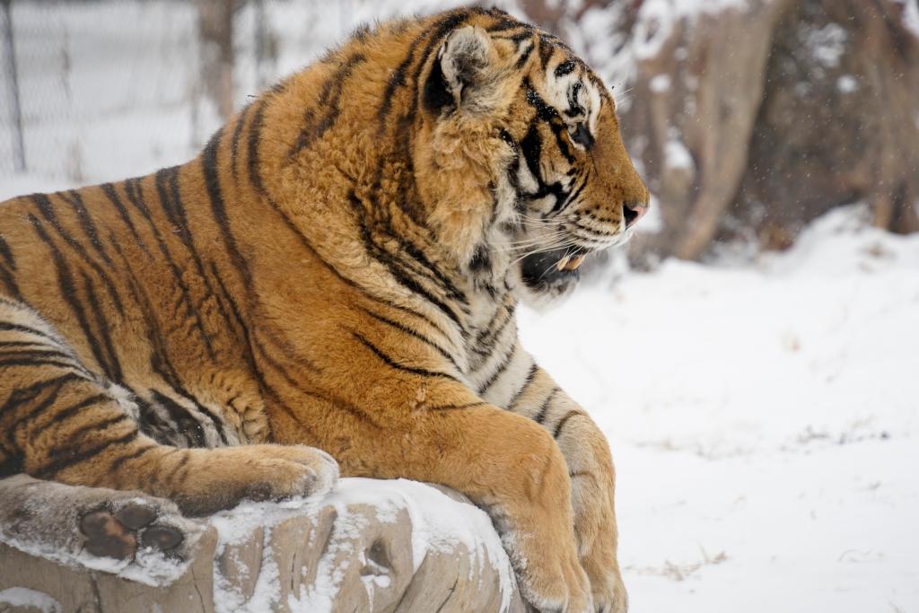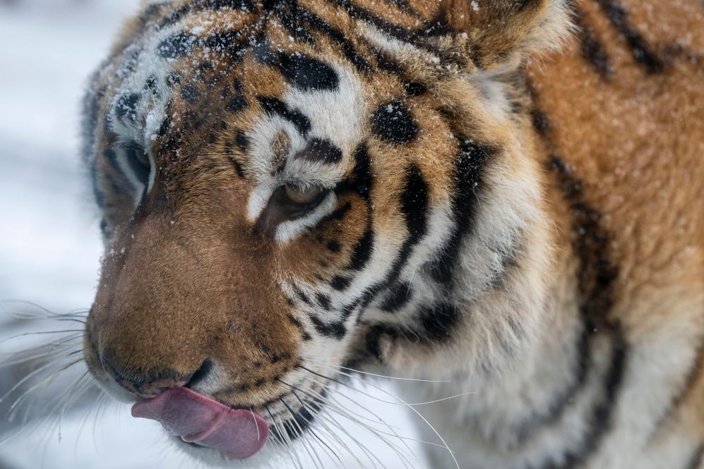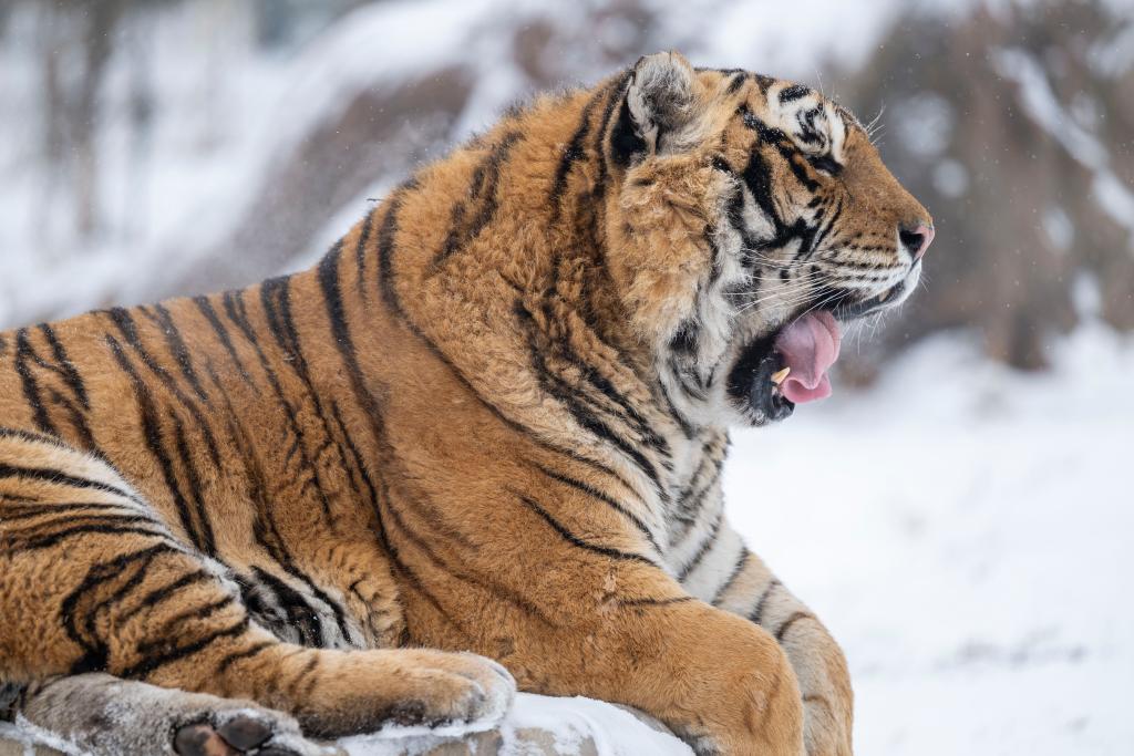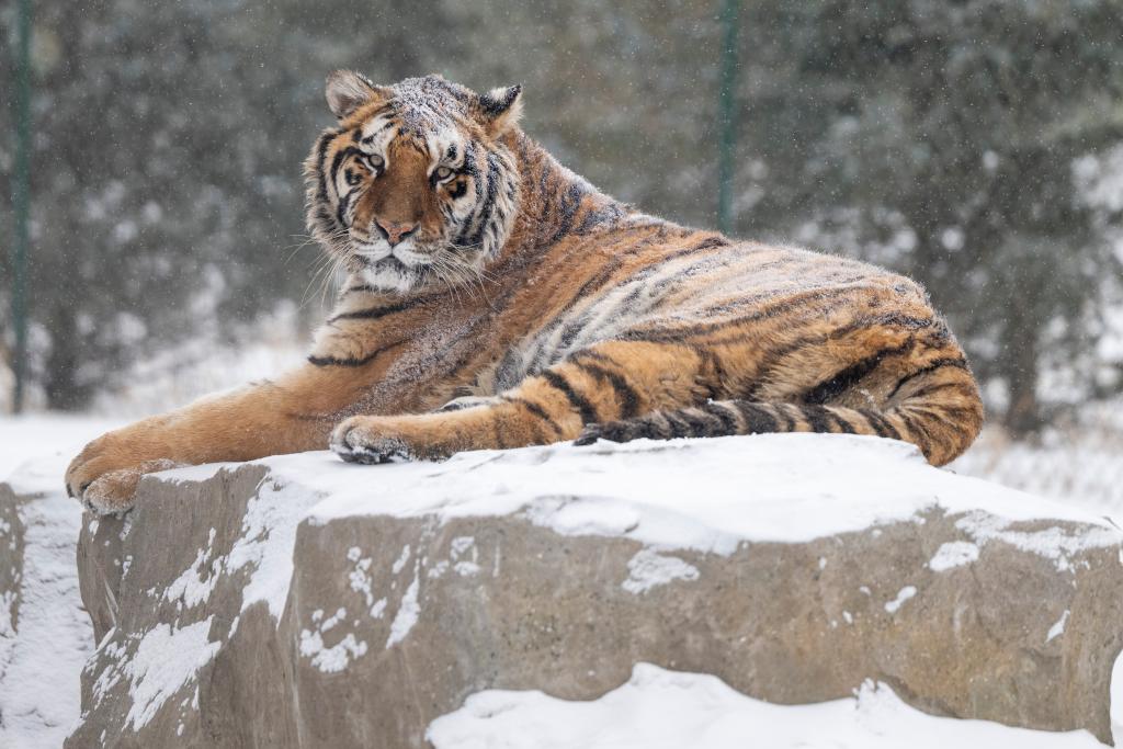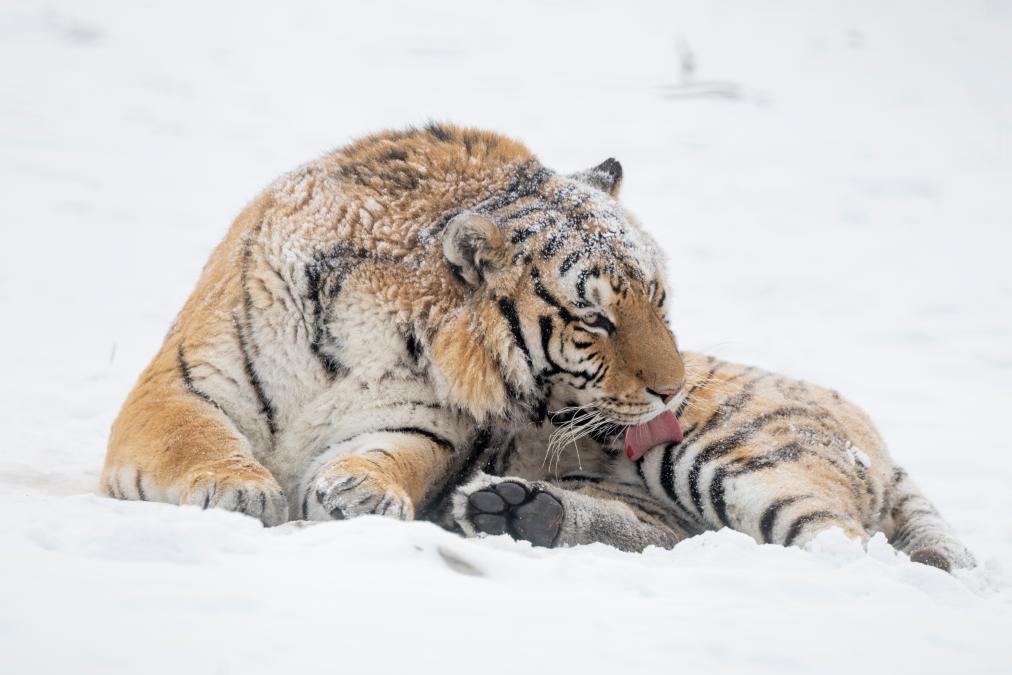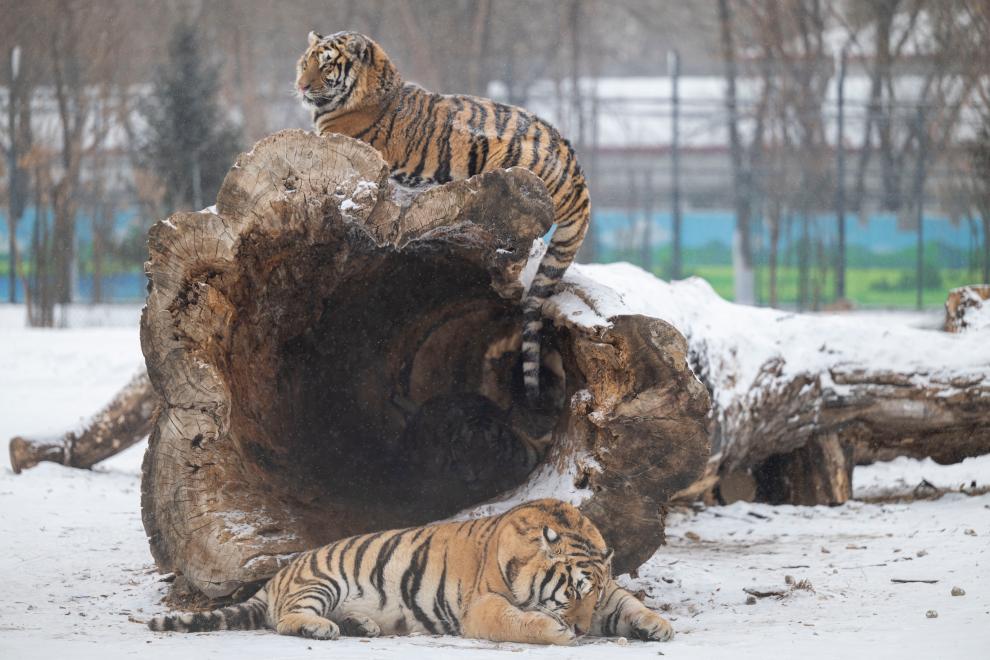 1月12日,冰城哈爾濱市迎來降雪天氣,在黑龍江東北虎林園,散放區的東北虎在雪地活動。