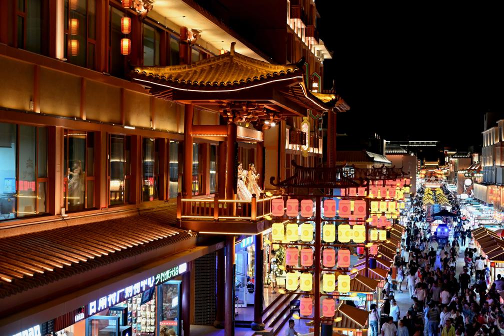 5月31日,游客在甘肅省敦煌夜市商業街游覽。