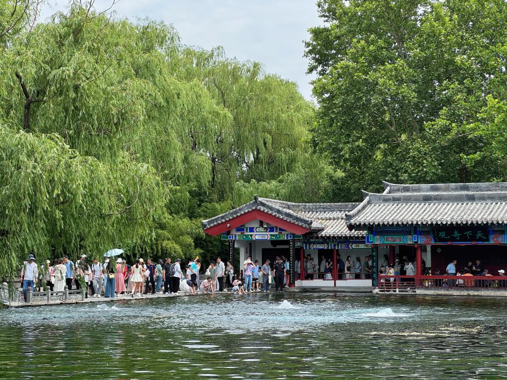 6月1日,在山東濟南明水古城景區,游客在欣賞梅花泉。