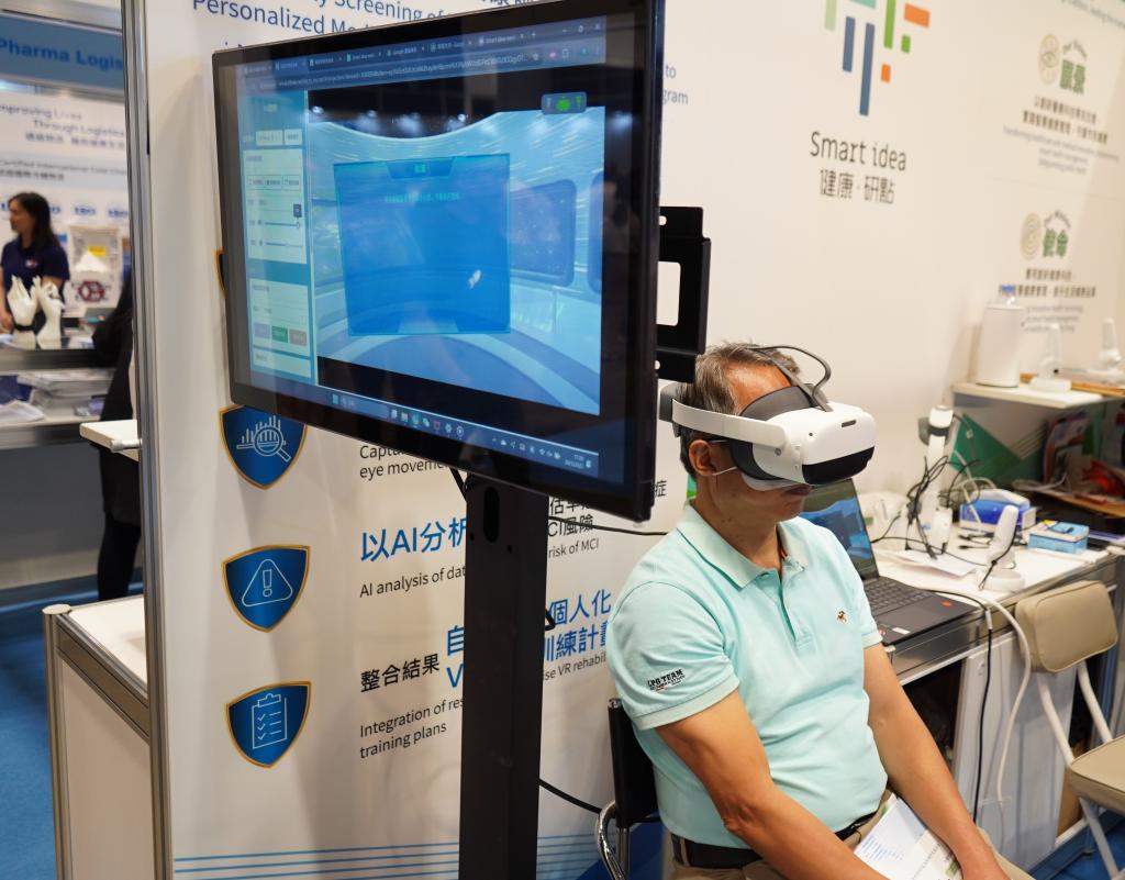 在復康及長者護理用品專區,參展商連雅嫻將一個VR眼動儀戴在眼睛上。“這個只有墨鏡盒大小的儀器具備眼動追蹤技術,能在5分鐘內對長者進行認知障礙症評估,並制訂個人化康復訓練計劃。”