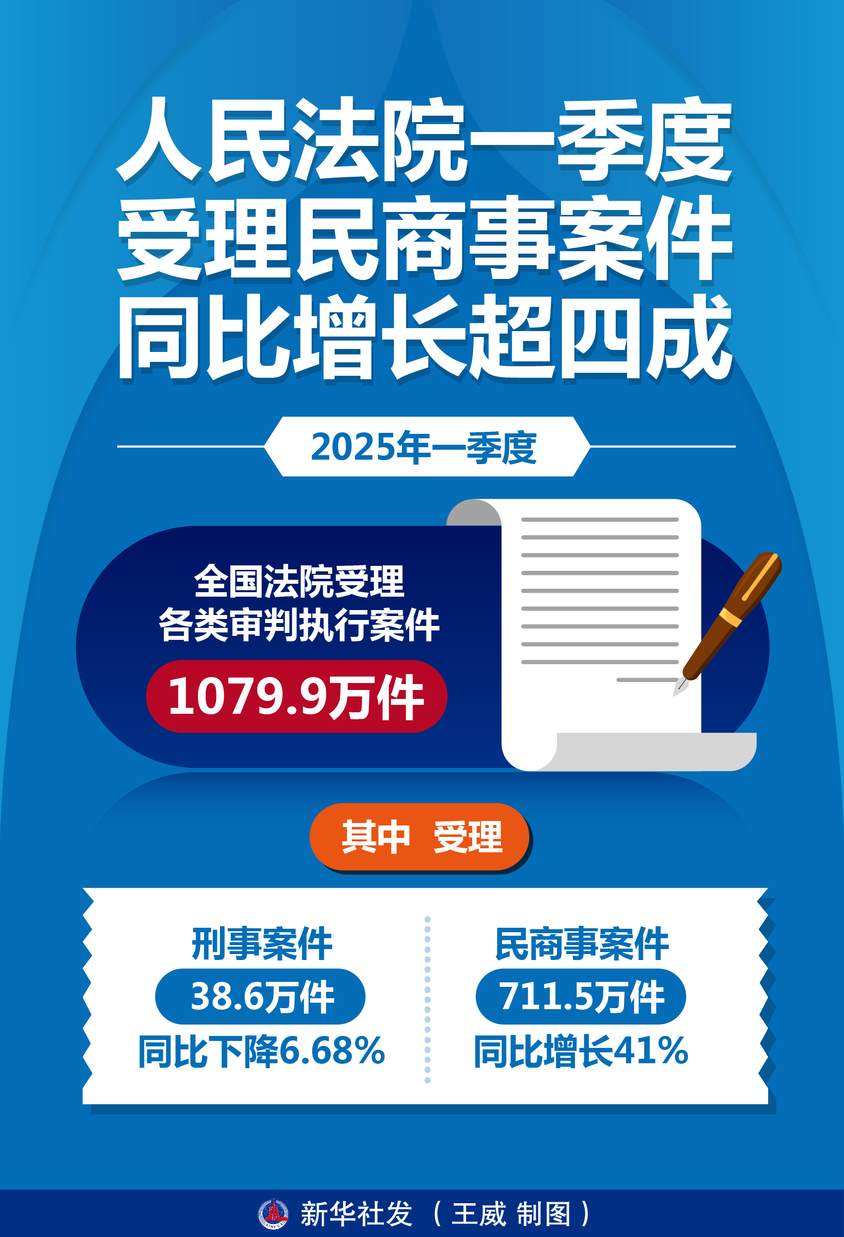 新華社北京4月17日電(記者馮家順、羅沙)2025年一季度,全國法院受理各類審判執行案件1079.9萬件,其中受理刑事案件38.6萬件,同比下降6.68%;民商事案件711.5萬件,同比增長41%。