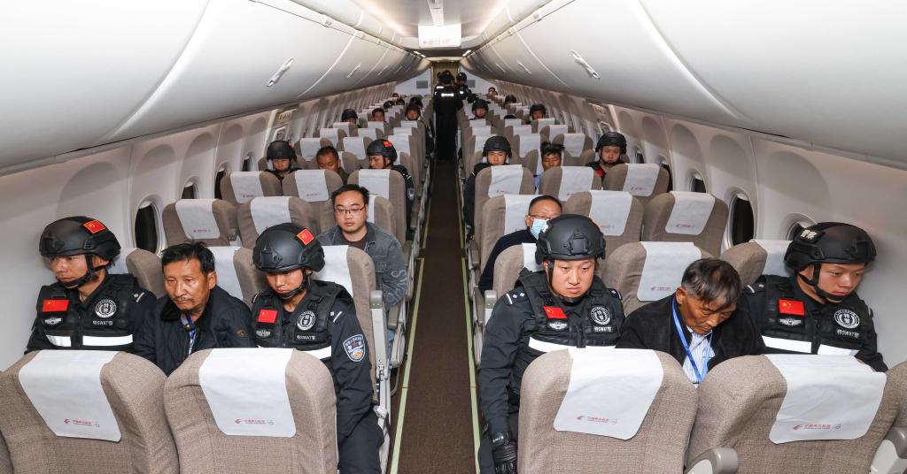 2024年1月30日,緬甸警方依法向我公安機關移交的白所成、白應蒼、魏懷仁、劉正祥、劉正茂、徐老發6名緬北果敢電詐犯罪集團重要頭目和另外4名重大犯罪嫌疑人在被押解回國的飛機上。新華社記者 殷剛 攝
