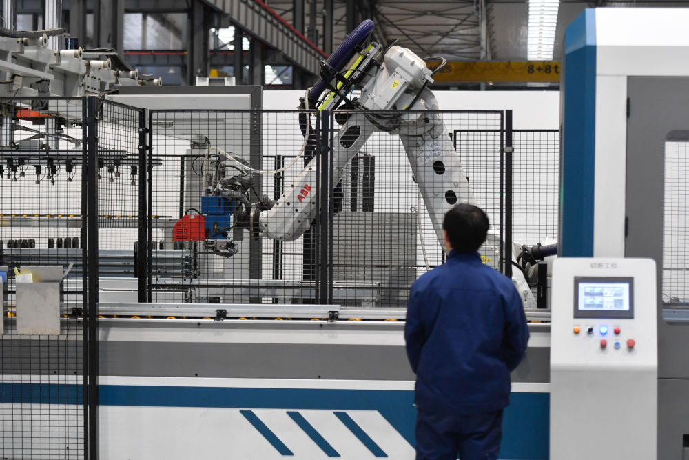 工人在位于杭州市临平区的西奥电梯数字工厂内的自动化智能生产线工作(2021年12月17日摄)。新华社记者 黄宗治 摄