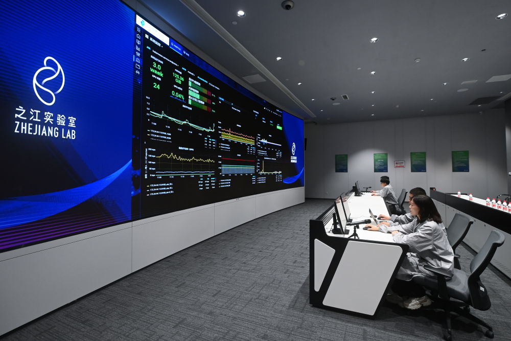 之江实验室计算与数据中心的工程师通过“之江云”系统监测服务器集群的运行状态(2022年6月23日摄)。新华社记者 黄宗治 摄