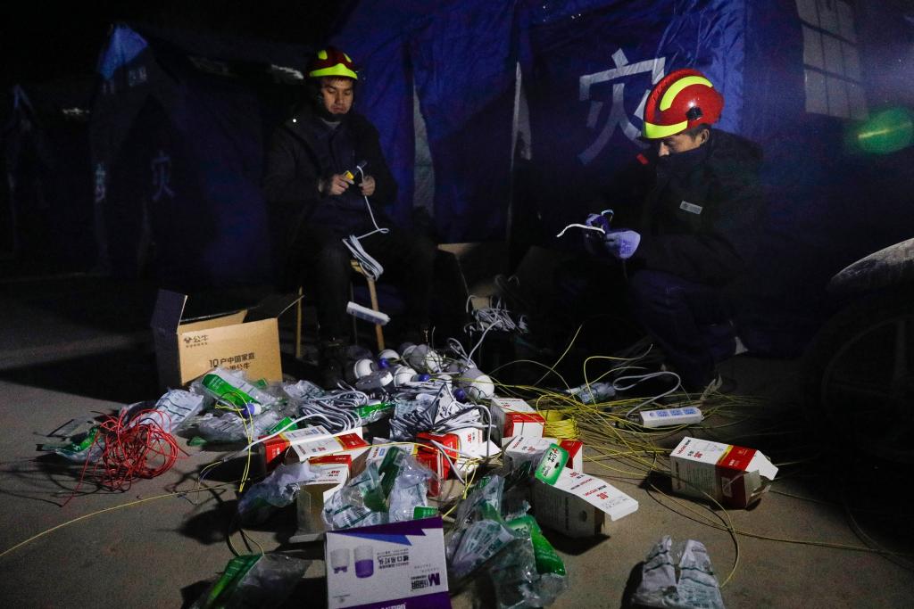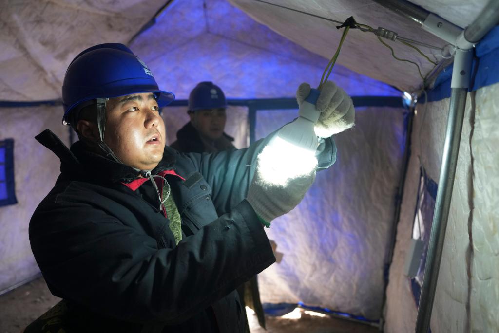 12月19日晚,在积石山县大河家镇大河村安置点,国家电网工作人员在做通电前的准备。新华社记者方欣摄