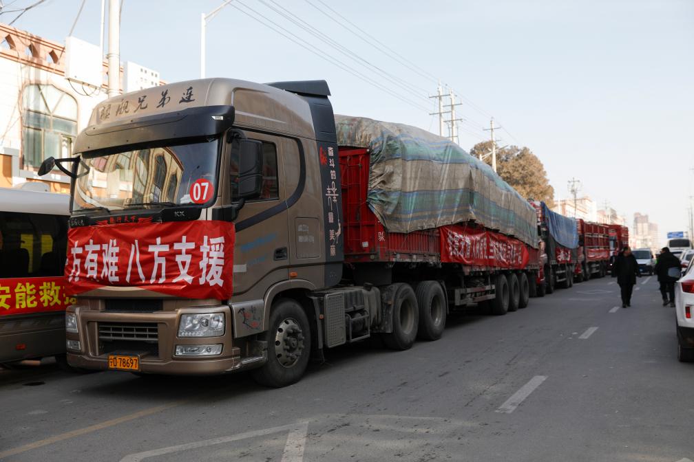 12月20日,在积石山县大河家镇大河村安置点外,救援物资等待卸货。新华社记者方欣摄