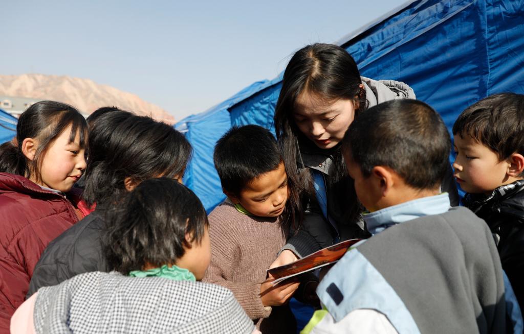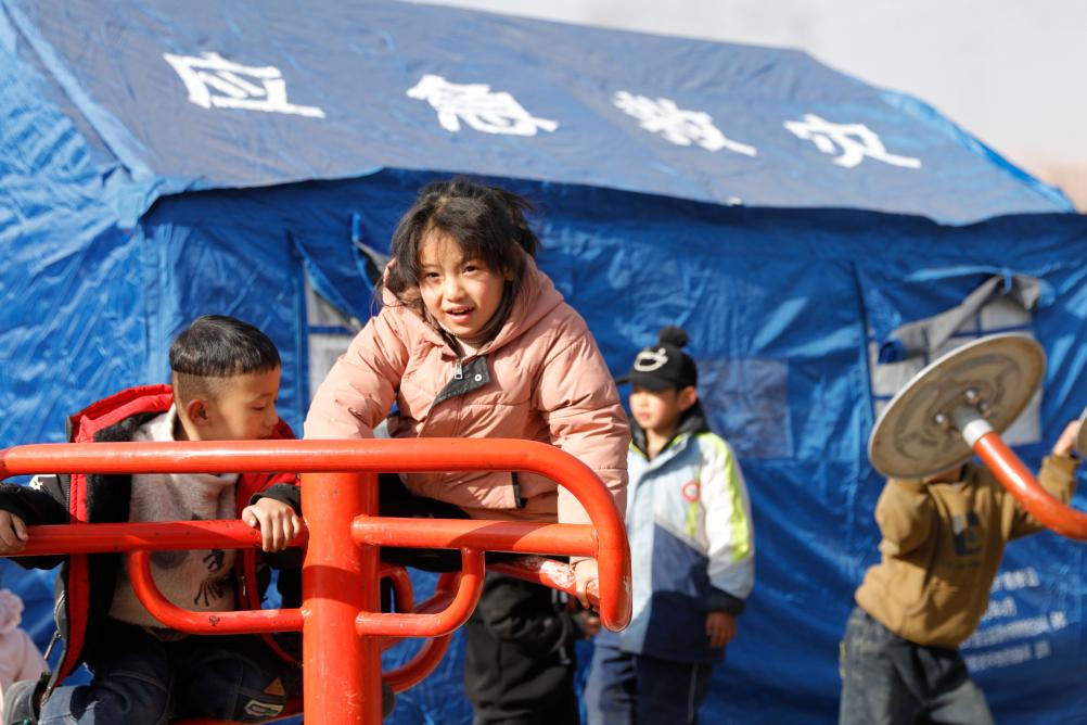 12月20日,在积石山县大河家镇大河村安置点,小朋友在帐篷外做游戏。新华社记者方欣摄