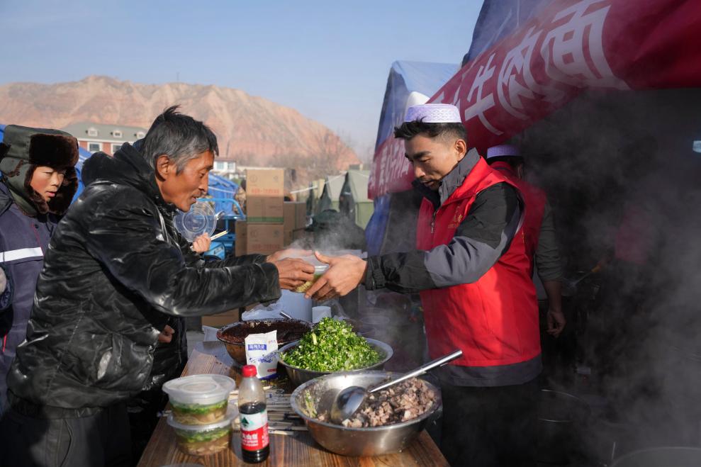 12月20日,在积石山县大河家镇大河村安置点,爱心企业给受灾群众提供免费牛肉面。新华社记者陈斌摄