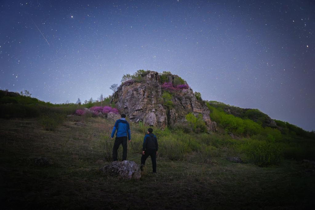 在黑龍江省牡丹江市寧安市拍攝的杜鵑花海和夜空(5月2日攝)。新華社發(王寶勳 攝)