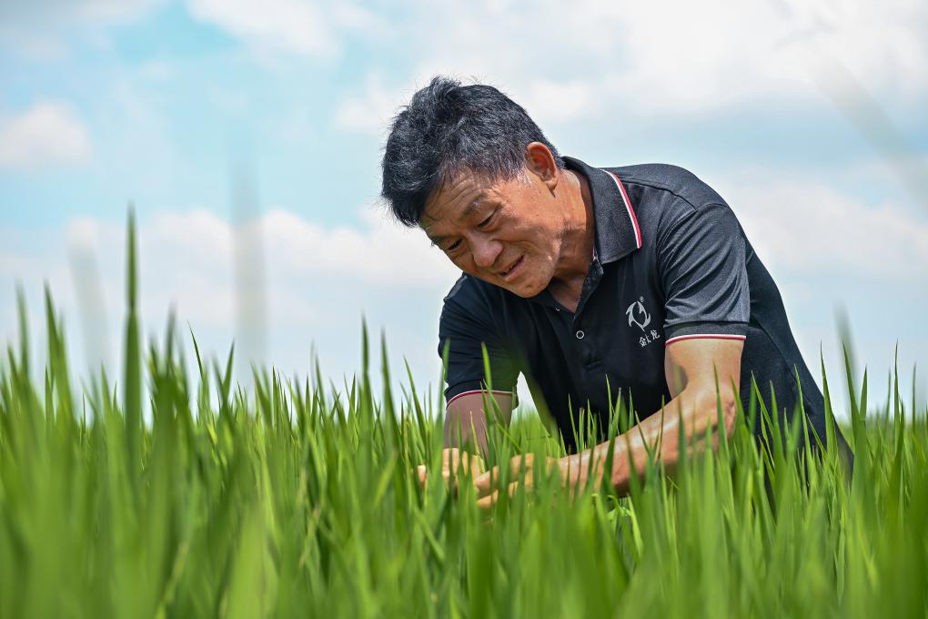 7月25日,安徽鳳陽小崗村種糧大戶程夕兵在田裏觀察水稻長勢。新華社記者 李鑫 攝