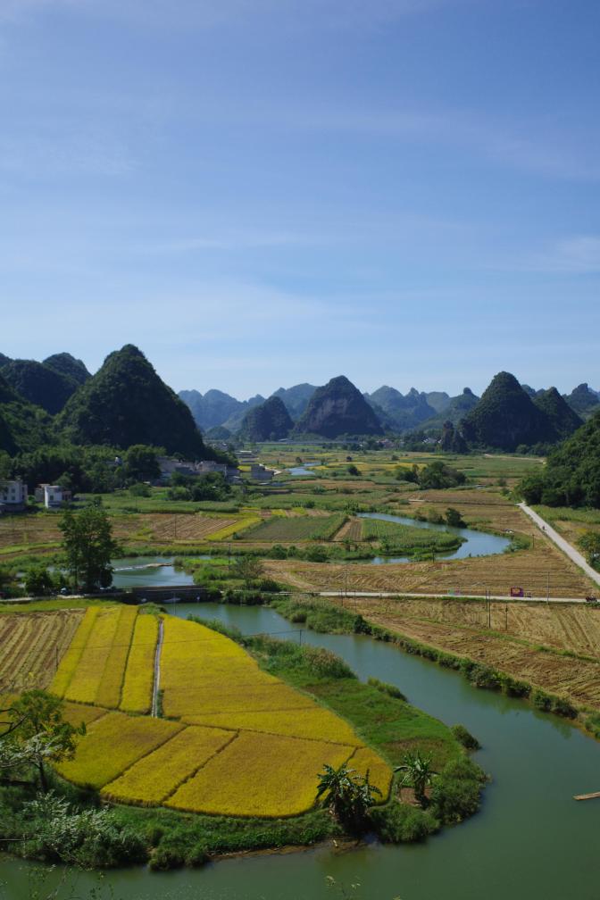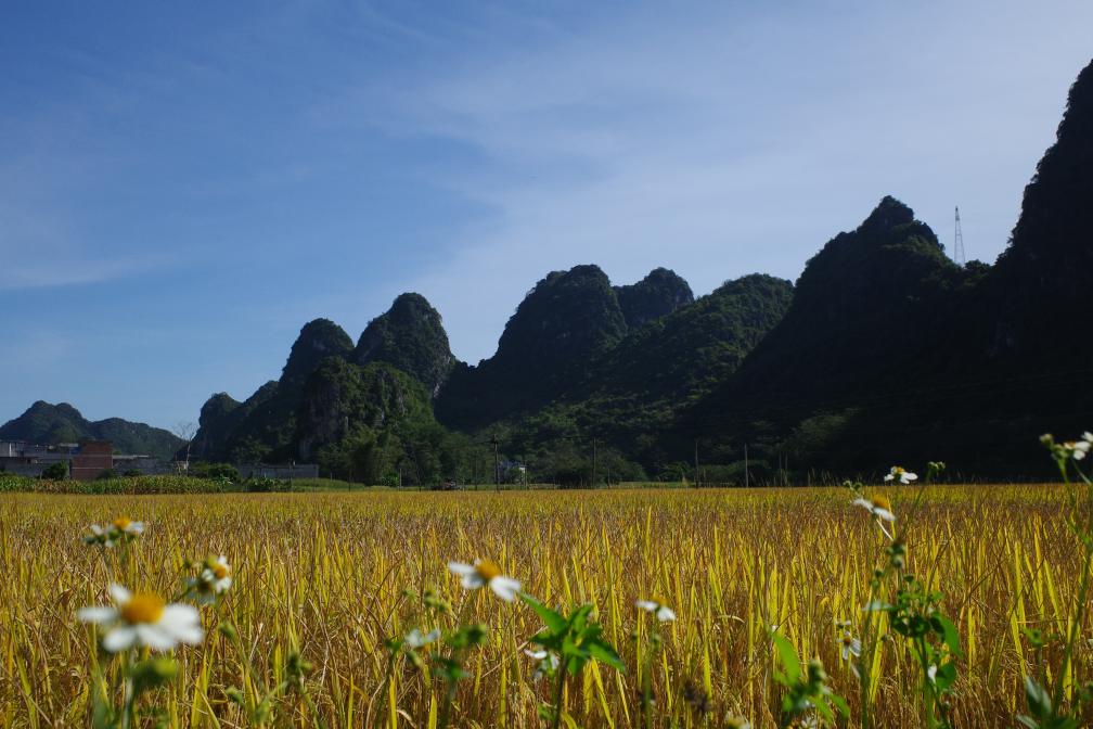 金黃的稻田嵌在村莊的空地裏,在這個岩溶地貌面積佔全縣面積77.4%的縣城裏,大山環抱着稀缺的平地,莊稼拔節、生長,共鳴着土地的脈搏。