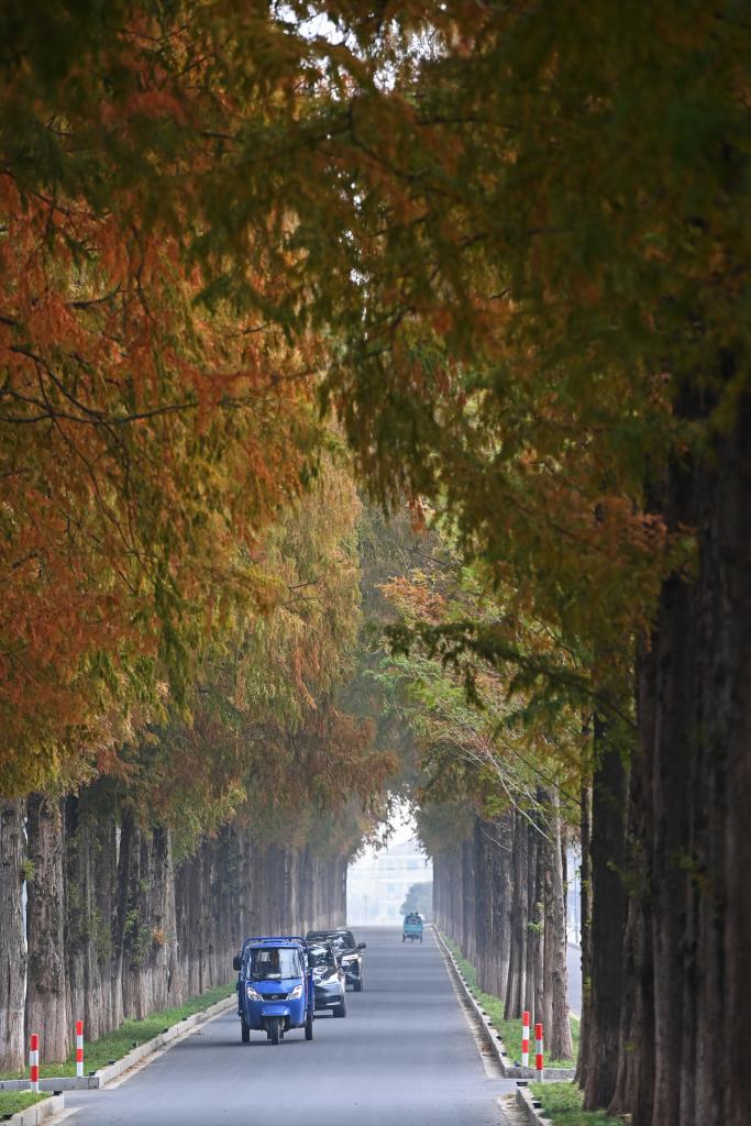 初冬時節,浙江省桐廬縣梅蓉村,村口一條長500米的水杉大道迎來最美的時節——水杉樹色彩斑斕,村民往來其間,構成一幅美麗的風景畫。
