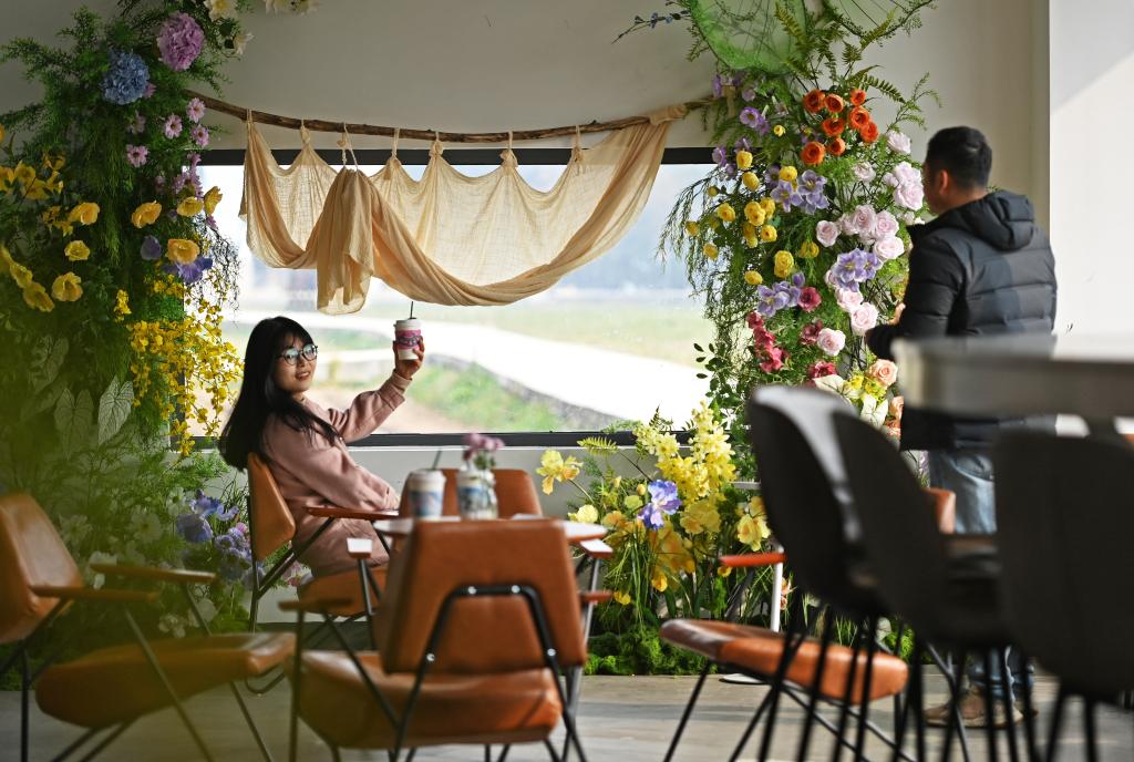 12月3日,游客在浙江省杭州市桐廬縣梅蓉村的鄉村會客廳宏逸咖啡館拍照打卡。新華社記者 盧哲 攝