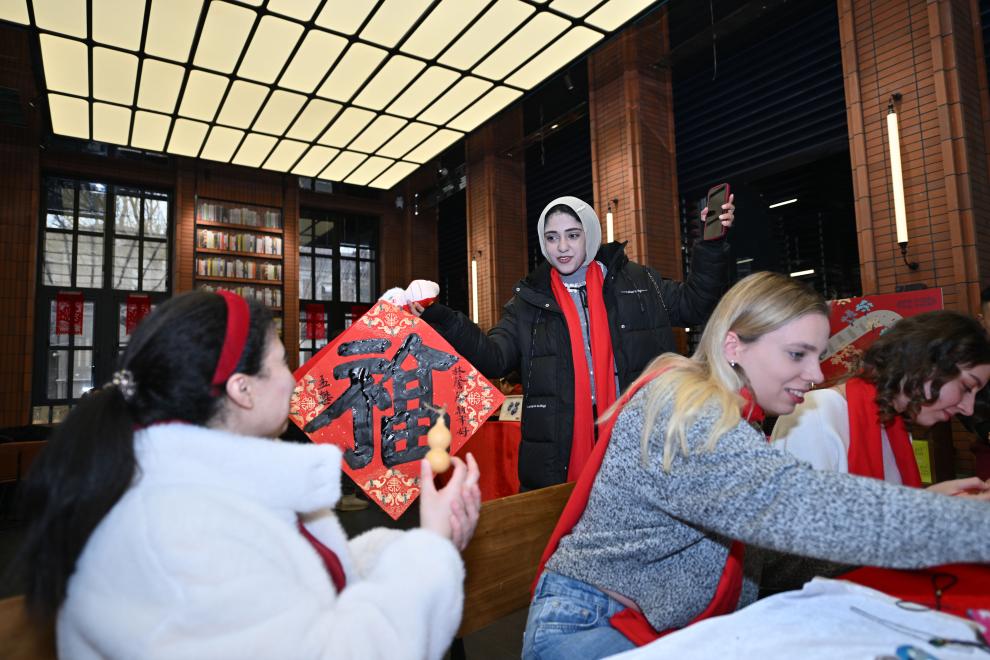 1月26日,留學生在天津意式風情區鐘書閣書店展示福字。 新華社記者 孫凡越 攝