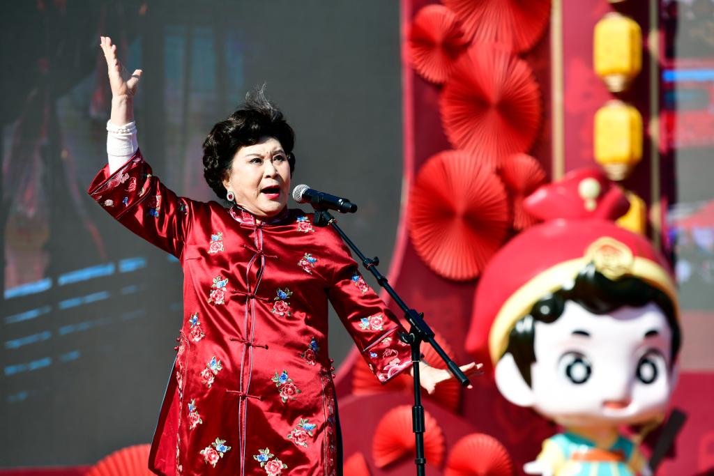 2月9日,河北省滄州市的曲藝藝人朱玉鳳在胡集書會上表演西河大鼓《羅成算卦》。