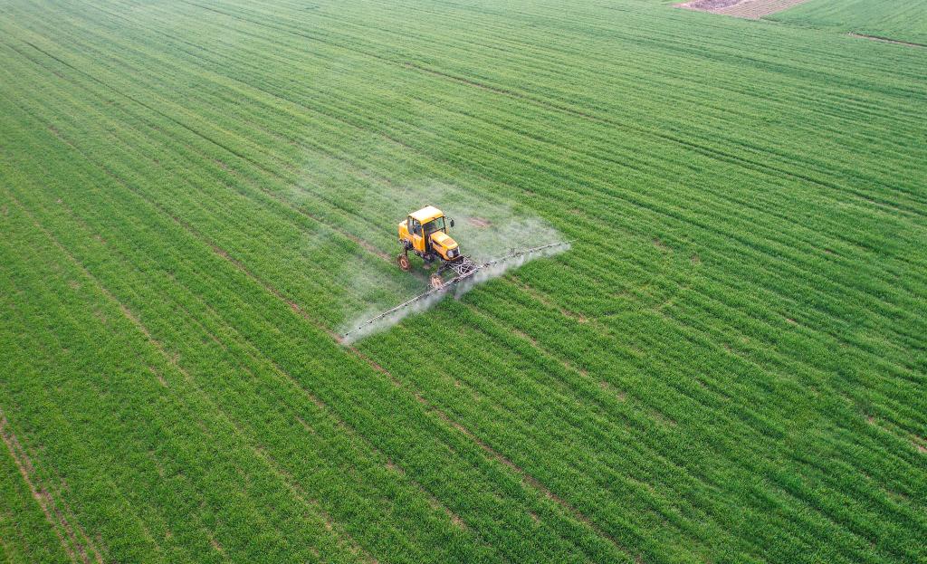3月12日,在河南省夏邑縣會亭鎮崔樓村,裝載着北斗導航系統的自走式植保機在麥田內進行噴藥作業。新華社發(王高超 攝)