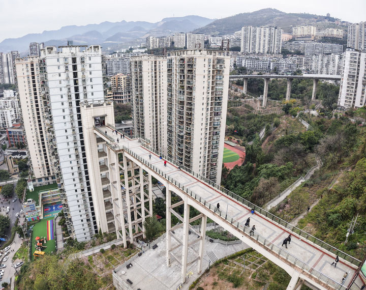 在奉節一處尋常街道,記者轉過一個路口,突然遇到一座20多層樓高的高空天橋。這座橋仿佛懸在空中,由結構簡單但穩定的框架支撐。由平地到高空的突然轉換,讓人不禁雙腿發軟。這座橋連接了濱江新城小區和對面的街道,對於生活在這裡的人來説,是實實在在的惠民橋。