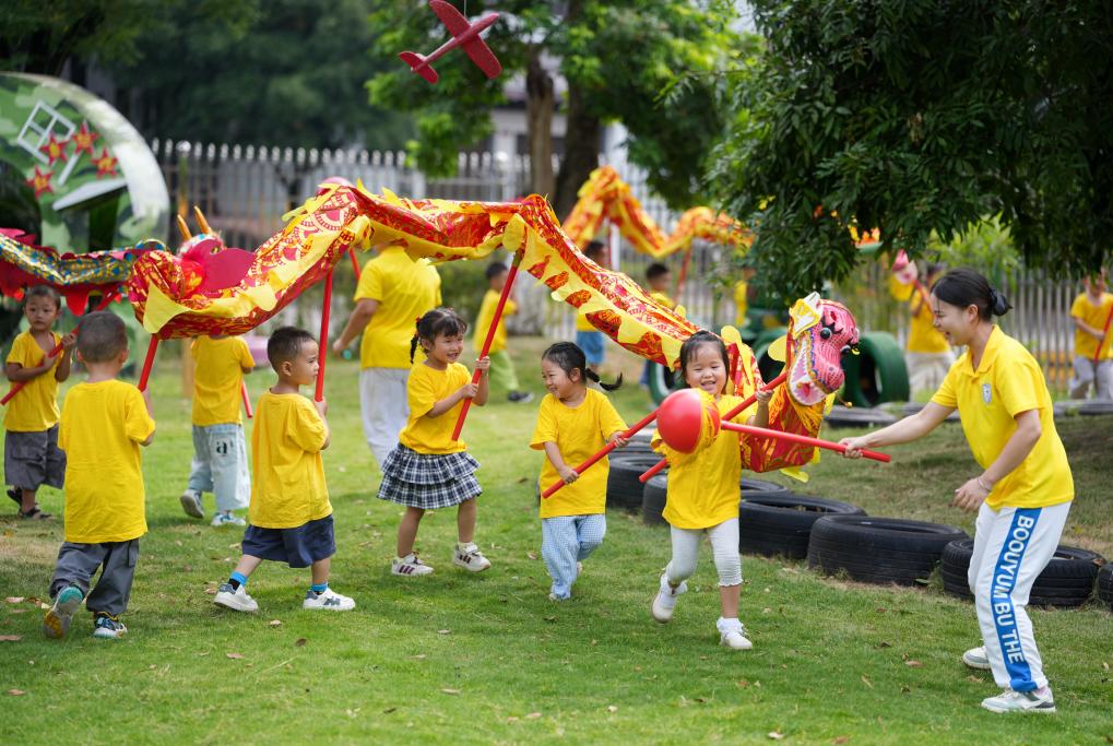 9月5日,四川瀘州白酒産業園區天驕托育園的老師帶領孩子們舞龍。新華社記者 江宏景 攝
