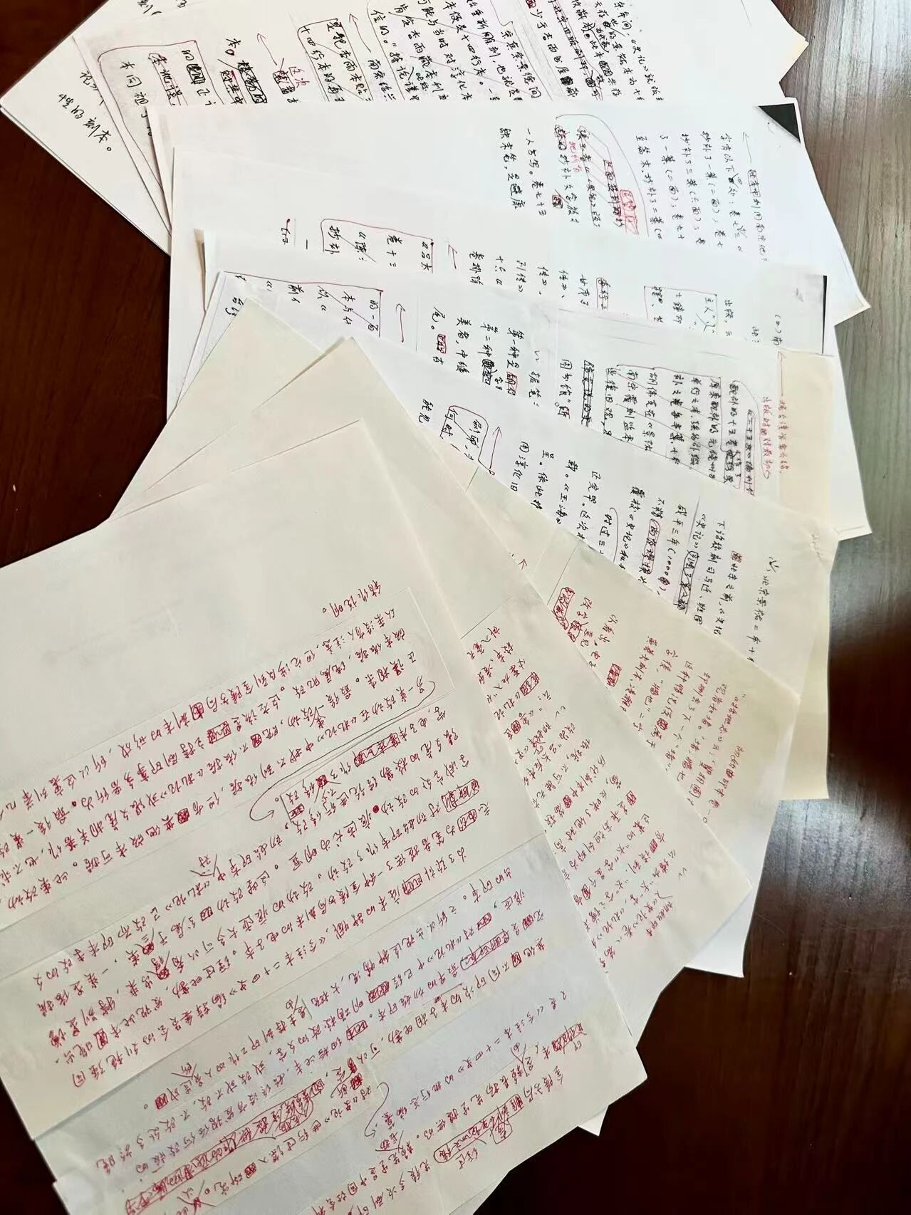 比A4還小的16開紙上,空隙處塞滿了紅色的黑色的小字。底稿寫不下,在旁邊貼紙條,還不夠,就在紙條上貼紙條。最多一頁貼了3000字。內容全是手寫,怕打字員打錯,每個字都一筆一畫。