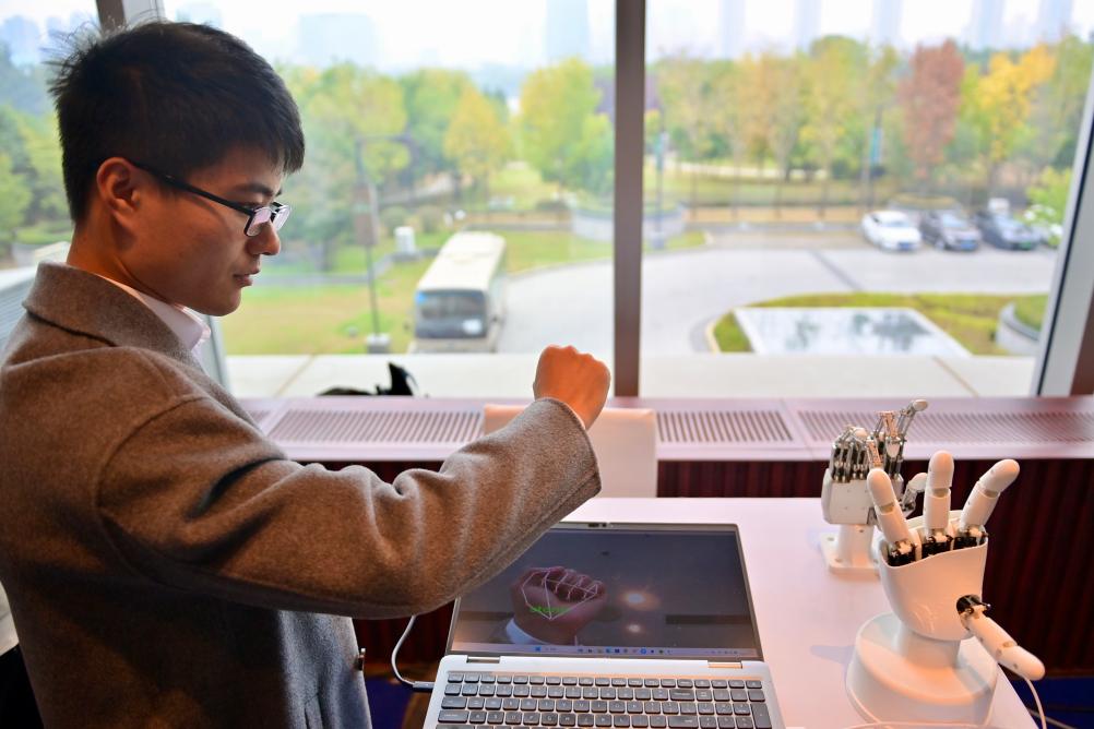 10月17日,在中國科學院瀋陽自動化研究所展&,工作人員演示“倣生五指靈巧手”展品。新華社記者 吳青昊 攝