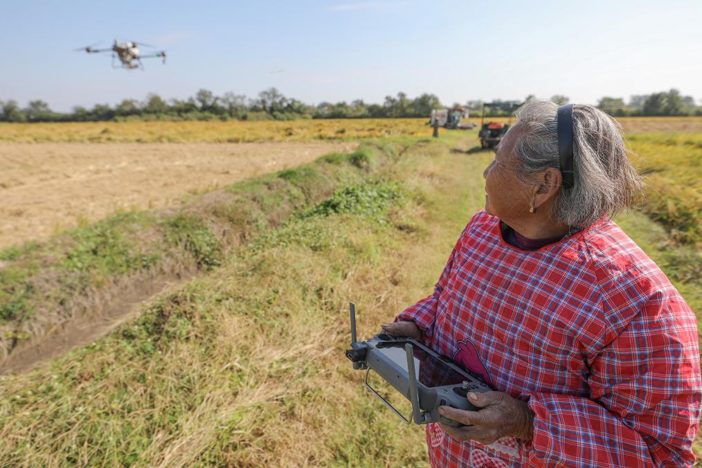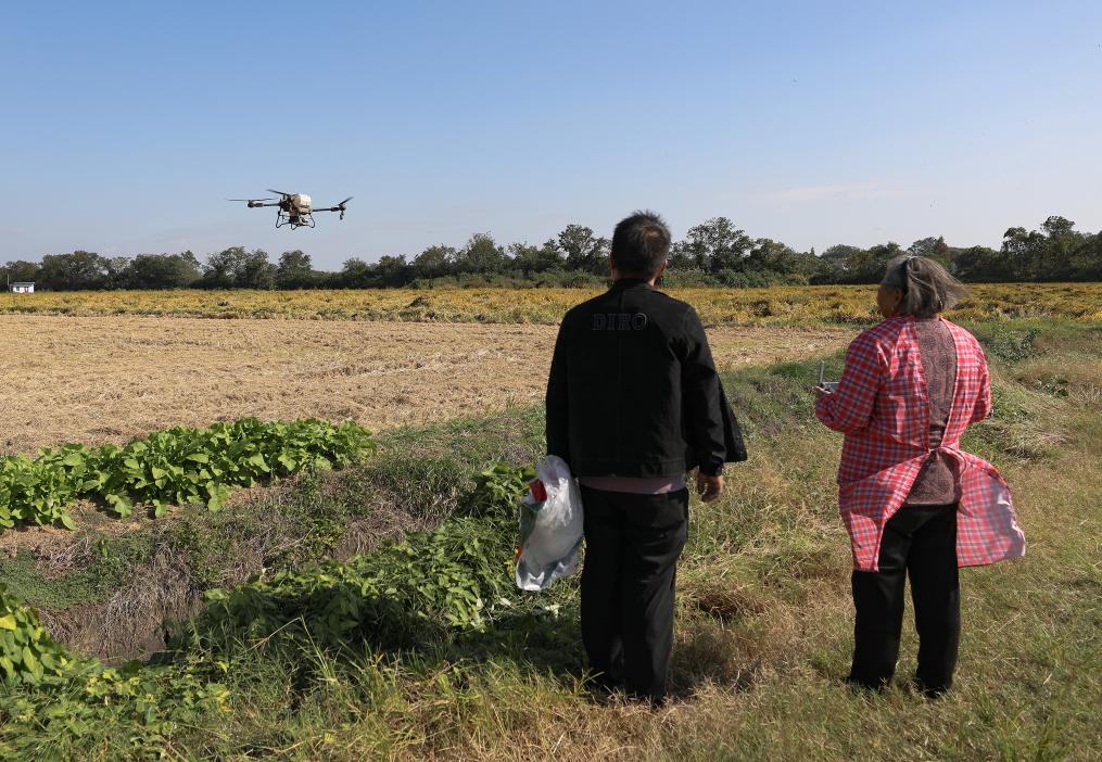 戴淑英(左)在王甜甜的指導下操作植保無人機。