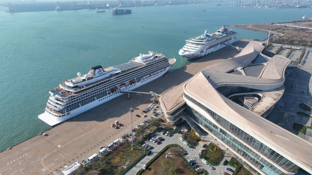 “夢想”號與“招商伊敦”號兩艘郵輪相繼靠泊天津國際郵輪母港。新華社發
