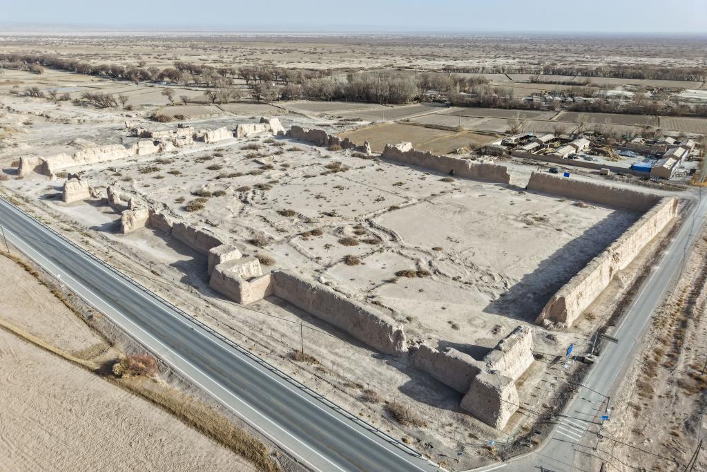 這是在甘肅省瓜州縣鎖陽城鎮常樂村拍攝的破城子遺址全景(無人機照片)。新華社記者 郎兵兵 攝