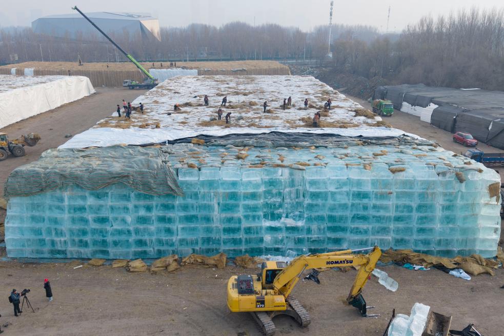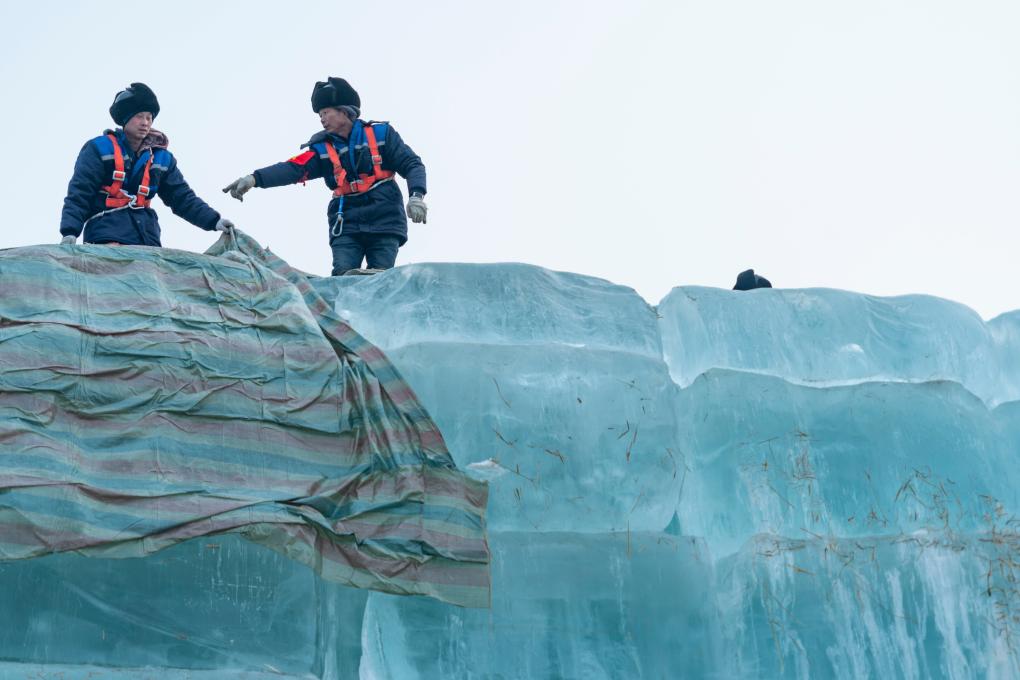 工作人員在拆除冰垛外層遮蓋物。新華社記者 謝劍飛 攝