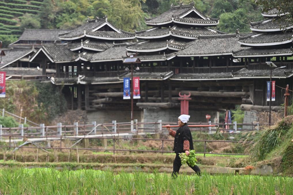 在三江侗族自治縣獨峒鎮岜團村,村民在風雨橋附近經過(2025年11月5日攝)。