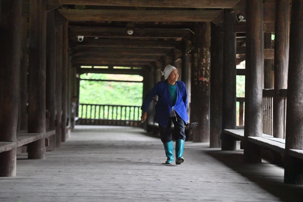 在三江侗族自治縣獨峒鎮岜團村,老人在風雨橋上經過(2025年11月5日攝)。