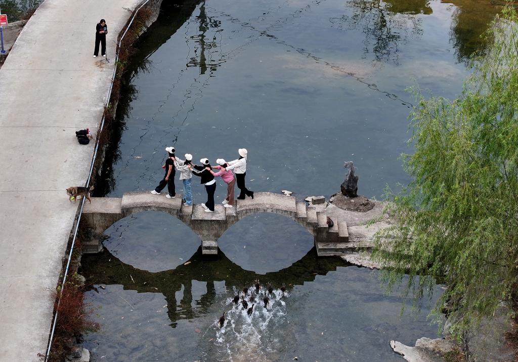 在柳州市柳江區進德鎮樂山村,游客在小橋上拍照(2025年11月1日攝)。