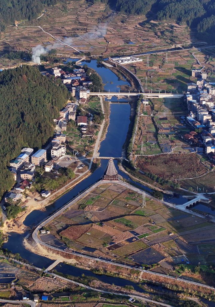 在融水苗族自治縣洞頭鎮洞頭村,多座小橋橫跨在穿村而過的小河上(2025年11月25日攝)。