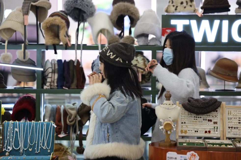 在北京市西城區一家商場,一名女士在選購冬帽。新華社記者 殷剛 攝
