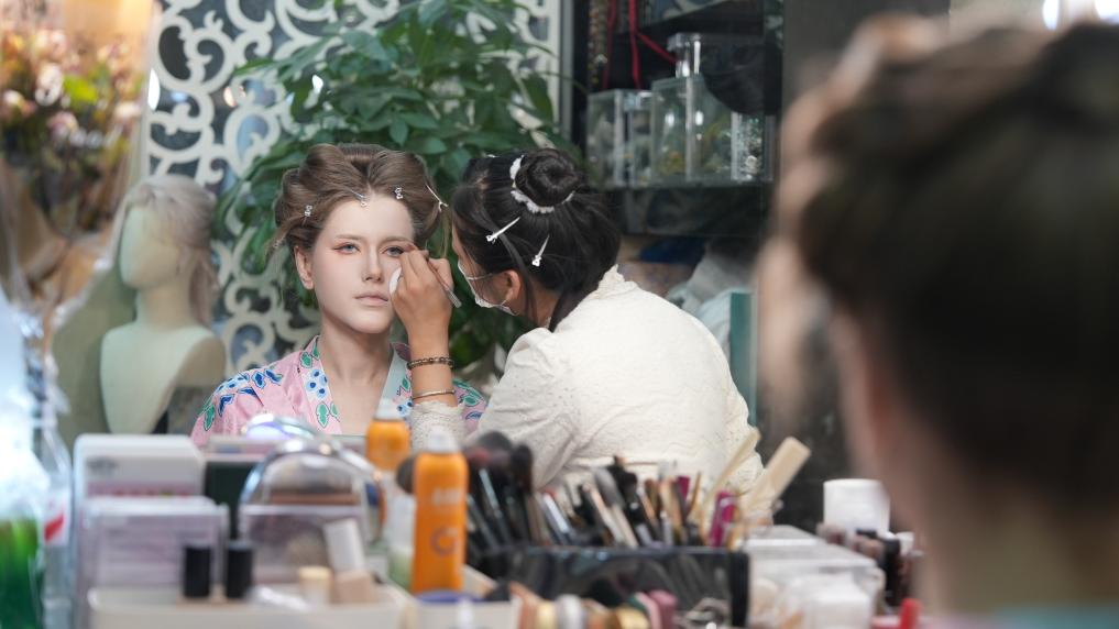 12月3日,阿娜斯塔西婭在漢服店裏上粧。新華社記者 楊靜 攝