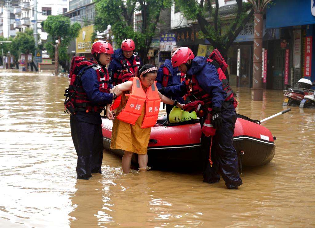↑6月24日,救援人員在貴州榕江縣城轉移群眾。