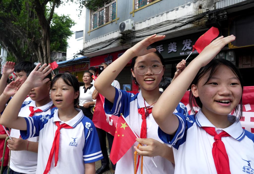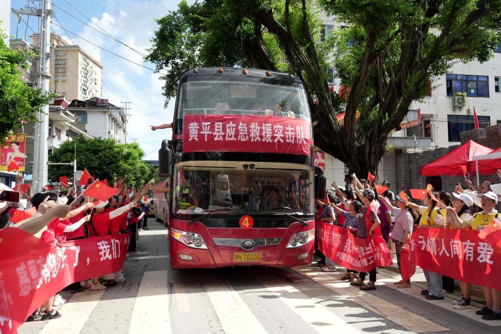 ↑7月3日,在貴州榕江縣城,當地居民沿街歡送救援隊伍返程。
