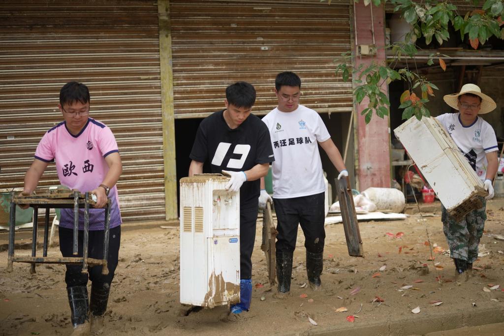 ↑6月26日,林進標(左二)在貴州榕江縣城清理受災物件。