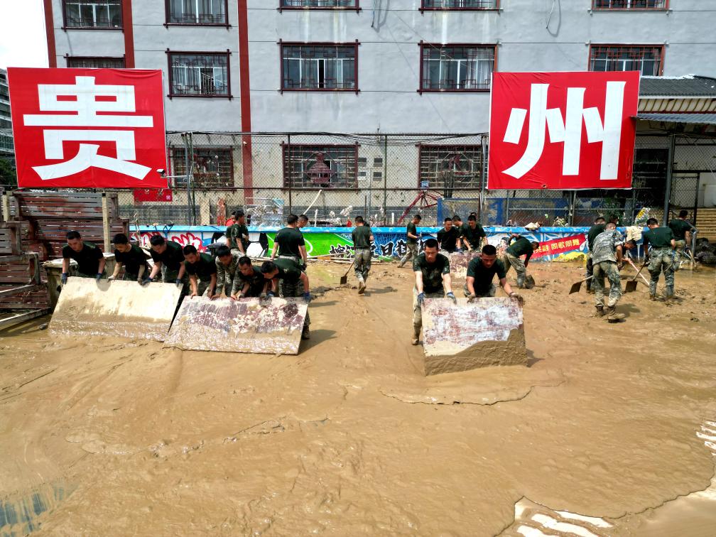↑6月26日,林進標(左一)在貴州榕江縣城參加清淤。