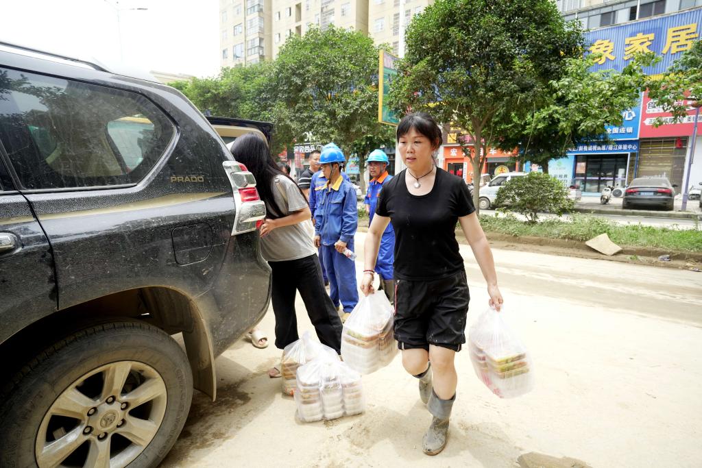 ↑6月26日,在貴州榕江縣城,工作人員將盒飯送到抗洪救災一線。