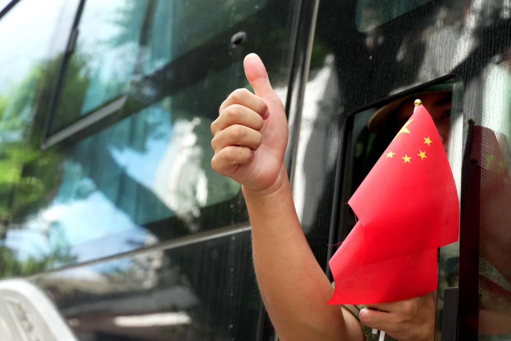 ↑7月3日,在貴州榕江縣城,救援隊員向歡送人群豎起大拇指。